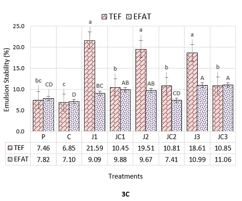 The term emulsion stability (ES) refers to the ability of an emulsion to resist changes in its characteristics over time. ES of meatball batters in terms of total expressible fluid (TEF%) and expressible fat (EFAT%) is presented in Fig. 3C. The values were recorded between 6.85-21.59% and 7.11-11.06% for TEF and EFAT, respectively. The formulation of meatballs was found to be significantly effective on ES (p<0.05). J1, J2 and J3 samples had the highest TEF compared to other samples (p<0.05), so that these samples were reported as the most unstable groups against fluid release from the structure. All the samples prepared with JAP and SC mixture (JC1, JC2, JC3) had similar TEF to samples prepared with STPP. This result showed that a rising trend was identified in liquid stability of the batters by utilization of JAP and SC together. Regarding EFAT values, it was found that the most effective phosphate-free treatment in maintaining fat retention was JC2, which had similar EFAT values to both of the P and C groups, and that had altogether lower EFAT compared to other treatments (p<0.05). From the results, it could be concluded that the most useful approach to obtain similar traits to phosphate-free emulsions is to include an average amount of JAP in combination with SC for maintaining overall emulsion stability. This supports the idea of emulsified products prepared with these ratios could have stronger storage characteristics and better technological quality. Afoakwah et al. (2015) stated that since JAP contains both inulin and protein, it may be a good emulsifying agent.