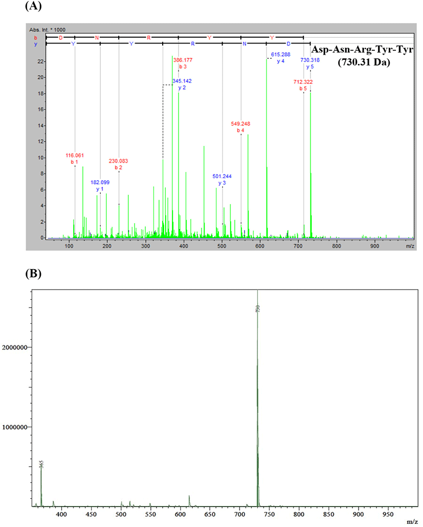 In our previous study, the IC50 value of the purified peptide from Alcalase hydrolysate of velvet antler against peroxyl radical was 0.343 mg/mL, suggesting that the purified peptide could possess potent antioxidant activity (Ding et al., 2019). As previous reported, MW and structure of the bioactive peptides is closely related to ACE inhibitory activity (Lee and Hur, 2017). However, the MW and amino acid sequence of the purified peptide have not been determined yet. Thus, in this study, amino acid sequence and MW of the purified peptide were determined using a Q-TOF ESI mass spectrometer. As shown in Fig. 1, the purified antioxidant peptide was identified as a pentapeptide DNRYY. The MW of this pentapeptide was 730.31 Da.